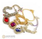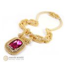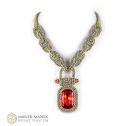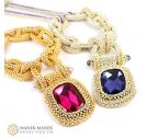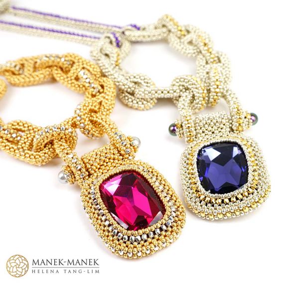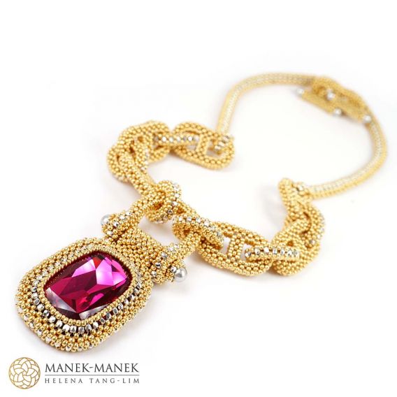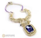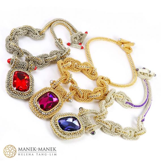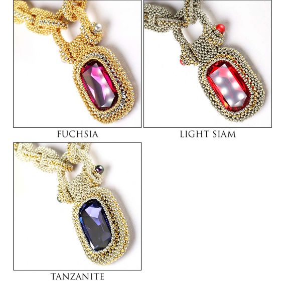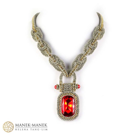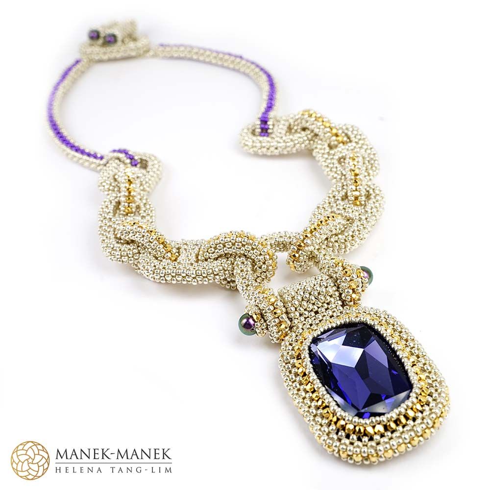 Inspired by the components of the anchor chain, La Chaîne d'Ancre epitomizes its values. It is big and bold and just like the anchor chain. It is made from flexible links of cubic right angle weave. Suspended from the “anchor chain” is not an anchor but a large and equally bold rhinestone which swings freely from a “shackle”. The toggle clasp is formed with a chain link with a double closure perfectly centering the clasp at the back of the neck. A very comfortable necklace.