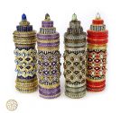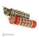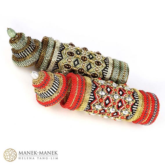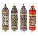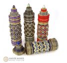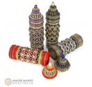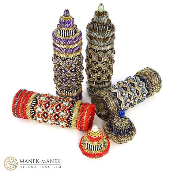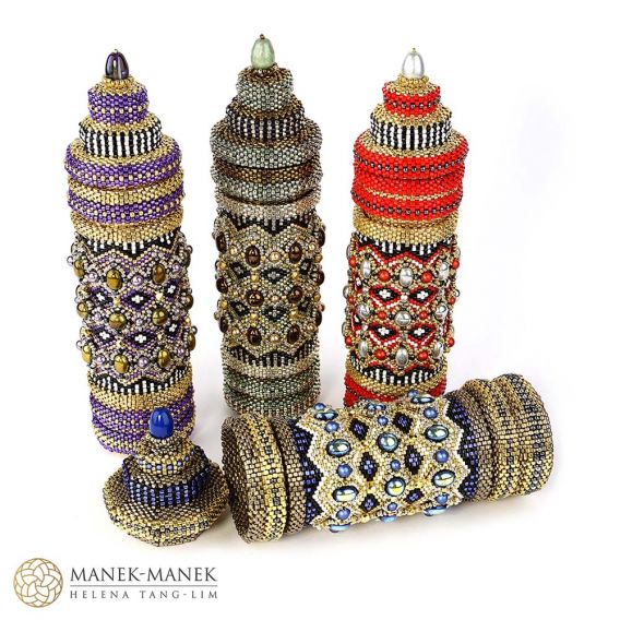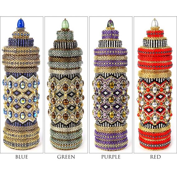 This contemporary interpretation reimagines the prayer wheel as a sculptural, self-supporting beaded vessel. Meticulously woven in peyote stitch, it features a central inner column encased by a rotating outer sleeve, echoing the movement of its traditional counterpart. Its richly textured surface is adorned with fire-polished beads, pearls, and cabochons, forming intricate patterns with a tactile, jewel-like presence. A fitted lid crowns the form, enclosing a hidden compartment—an intimate space for storing small keepsakes or personal treasures.