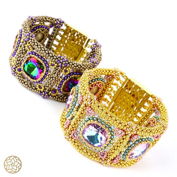 The sparkling glass cabochons glows with brilliance, encased by an intricately beaded cubic right angle weave and double cubic right angle weave frame. Delicate pearls and fire-polished beads further elevate the cuff’s luxurious appeal, while the dazzling cubic zirconia embellished clasp adds a touch of regal sophistication.