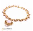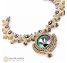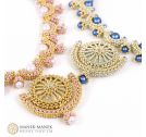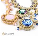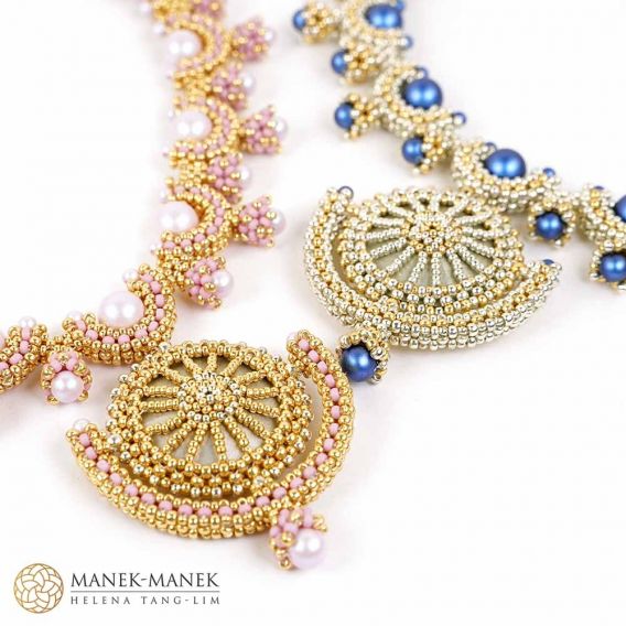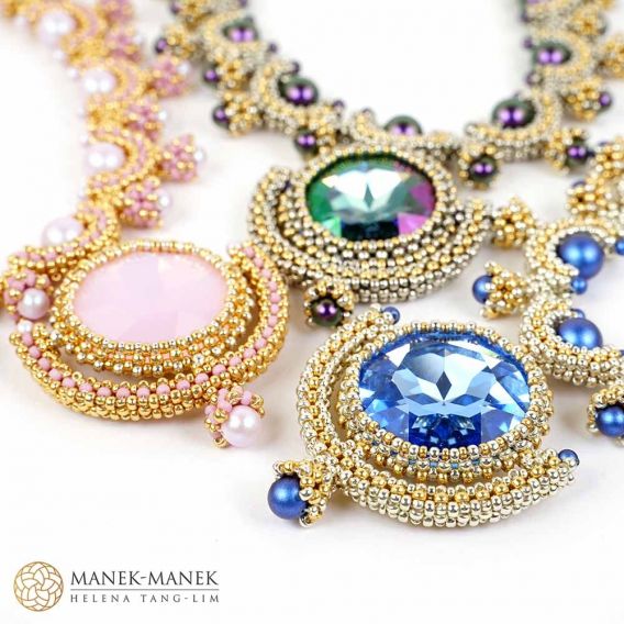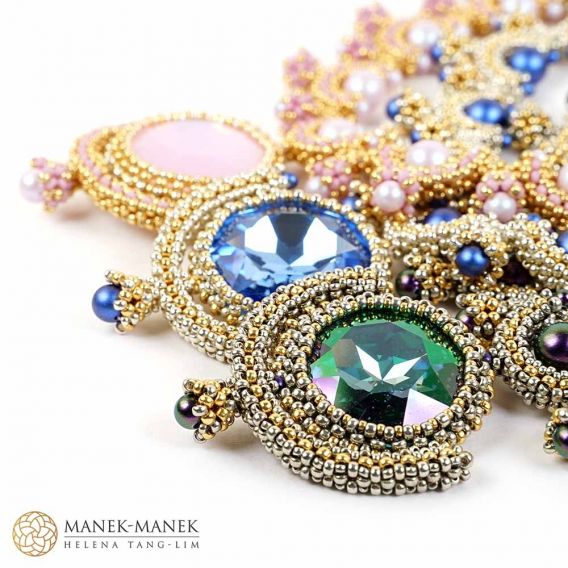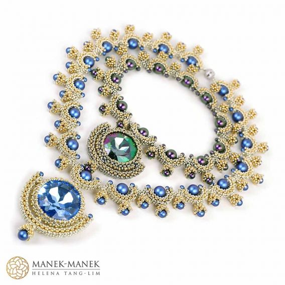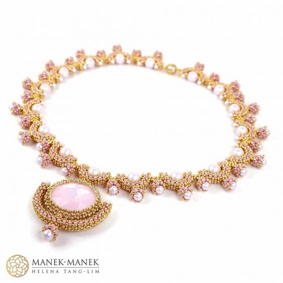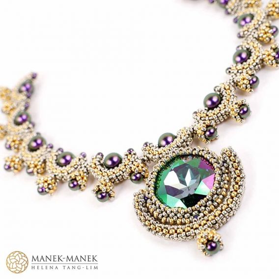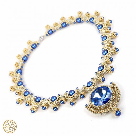 La Dolce Vita uses Cubic Right Angle weave to form graceful arcs which embrace a beautiful Swarovski pearl. These arcs form a gentle curve to sit at the base of your neck. And suspended in the center is a magnificent crystal that glitters and shines brightly.
