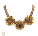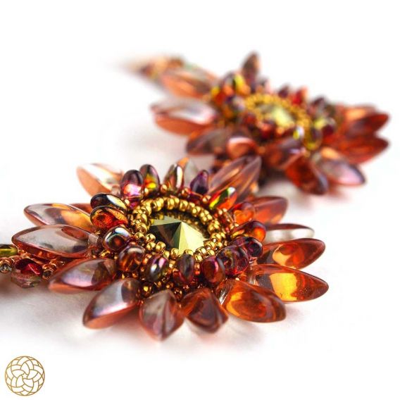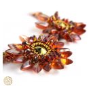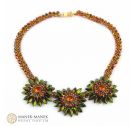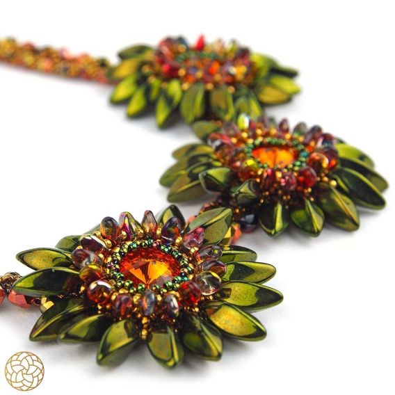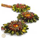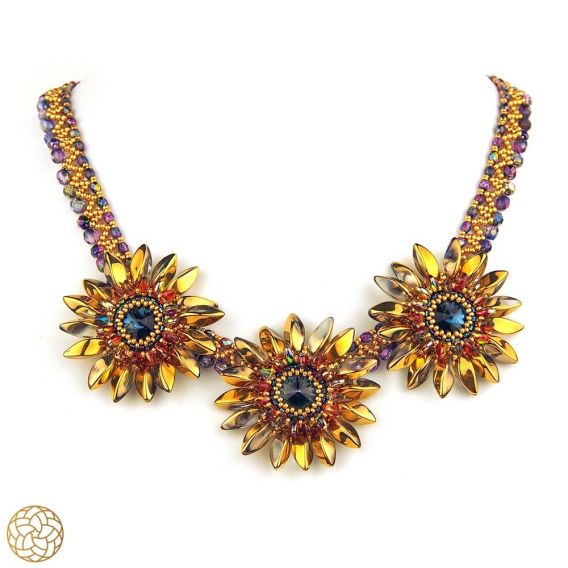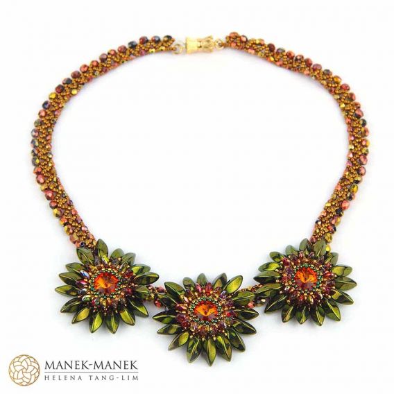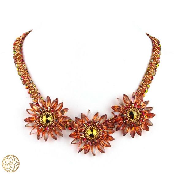 A quirky fun necklace to usher in the Spring. Czech twists form flower petals surrounding a crystal rivoli centre. A series of three flowers float along a Chevron chain rope of Czech fire polished beads. And of course, for that special elegance, an Elegant Elements Clasp.